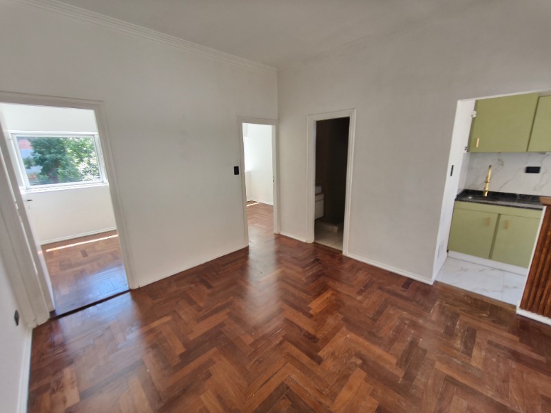 Living comedor con cocina integrada por barra, dos dormitorios y baño completo.