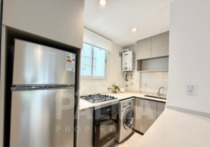 Cocina integrada, moderna y funcional con espacio para lavarropas.