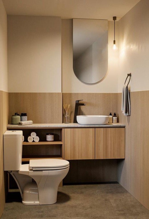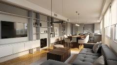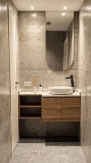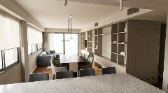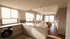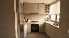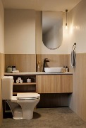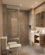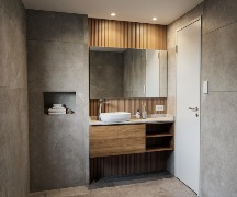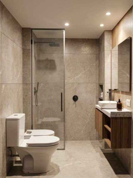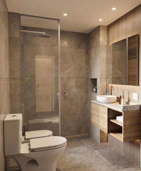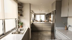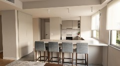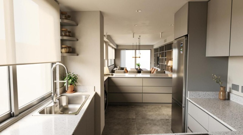 Cocina y baños con muebles completos a medida en melamina. Mesadas de mármol. Artefactos de cocina de primera marca en acero inoxidable, pileta marca Johnson. Grifería principal FV monocomando y losas sanitarias de primera marca.